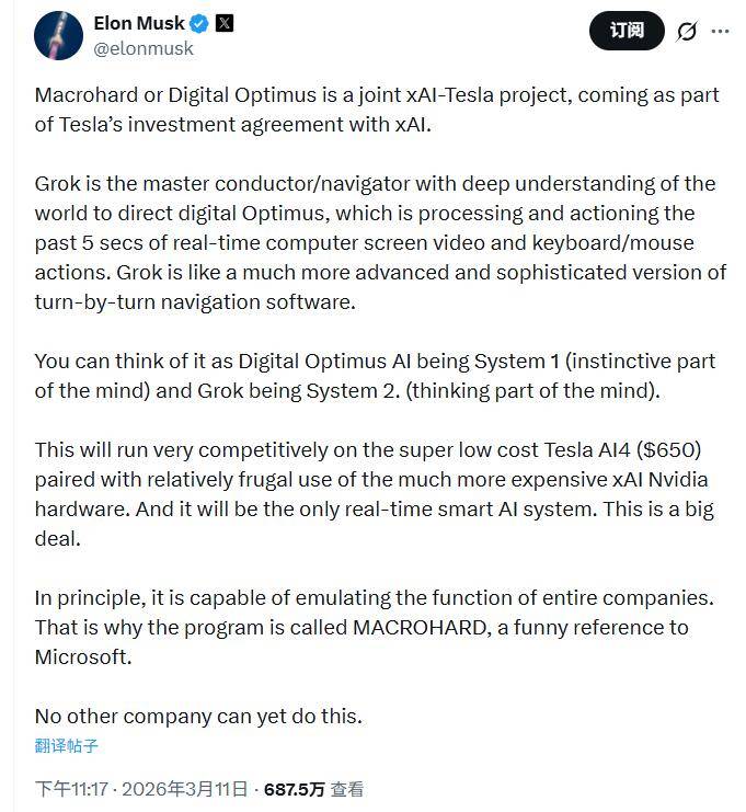 旨正在打制可以或许从动施行软件使命的AI智能系统统。迈向可以或许施行复杂使命的AI智能体时代。若是马斯克的设想成为现实,已有近20名xAI工程师去职或转岗,但内部备忘录显示,由其从导特斯拉硬件施行层的运做。特斯拉取他的AI草创公司xAI将结合开辟一个名为“Digital Optimus”(数字擎天柱)、又称Macrohard(巨硬)的新AI项目,跟着将来项目规模的扩大。